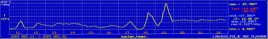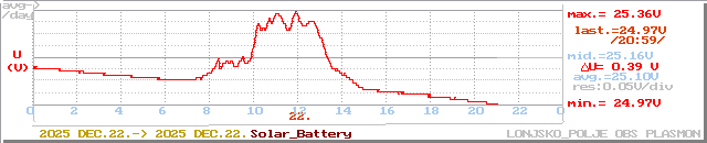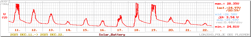 (refresh in every 4 hours) ![]() ![]() ![]() Temperatures: /today/ 1:sensor /deepness is ~1m under the soil/ ![]() 2: LEMI electronics /in the mini isolated box house/ ![]() 3 : Dgrab24 A/D system: ![]() Solar battery voltage /today/ ![]() Longer time period: 1 minute data. /H,D,Z component / today and the latest 11 days/ ![]() ![]() ![]() Temperatures: /today and the latest 11 days/ 1:sensor /deepness is ~1m under the soil/ ![]() 2: LEMI electronics /in the mini isolated box house/ ![]() 3 : Dgrab24 A/D system: ![]() Solar battery voltage /today and the latest 11 days/ ![]() |